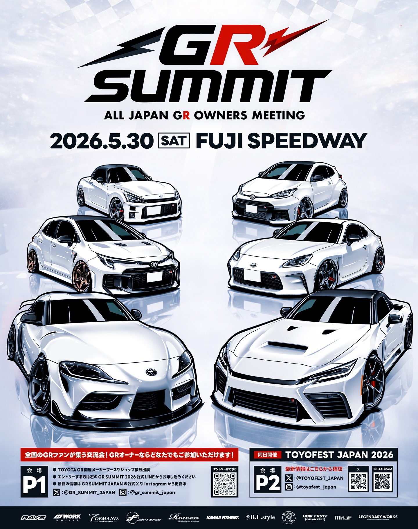 A national GR-owner gathering at Fuji Speedway P1, open to all GR-brand vehicle owners. Running simultaneously in the adjacent P2 car park is TOYOFEST JAPAN 2026. Entry is by registration via the official GR SUMMIT LINE account only.