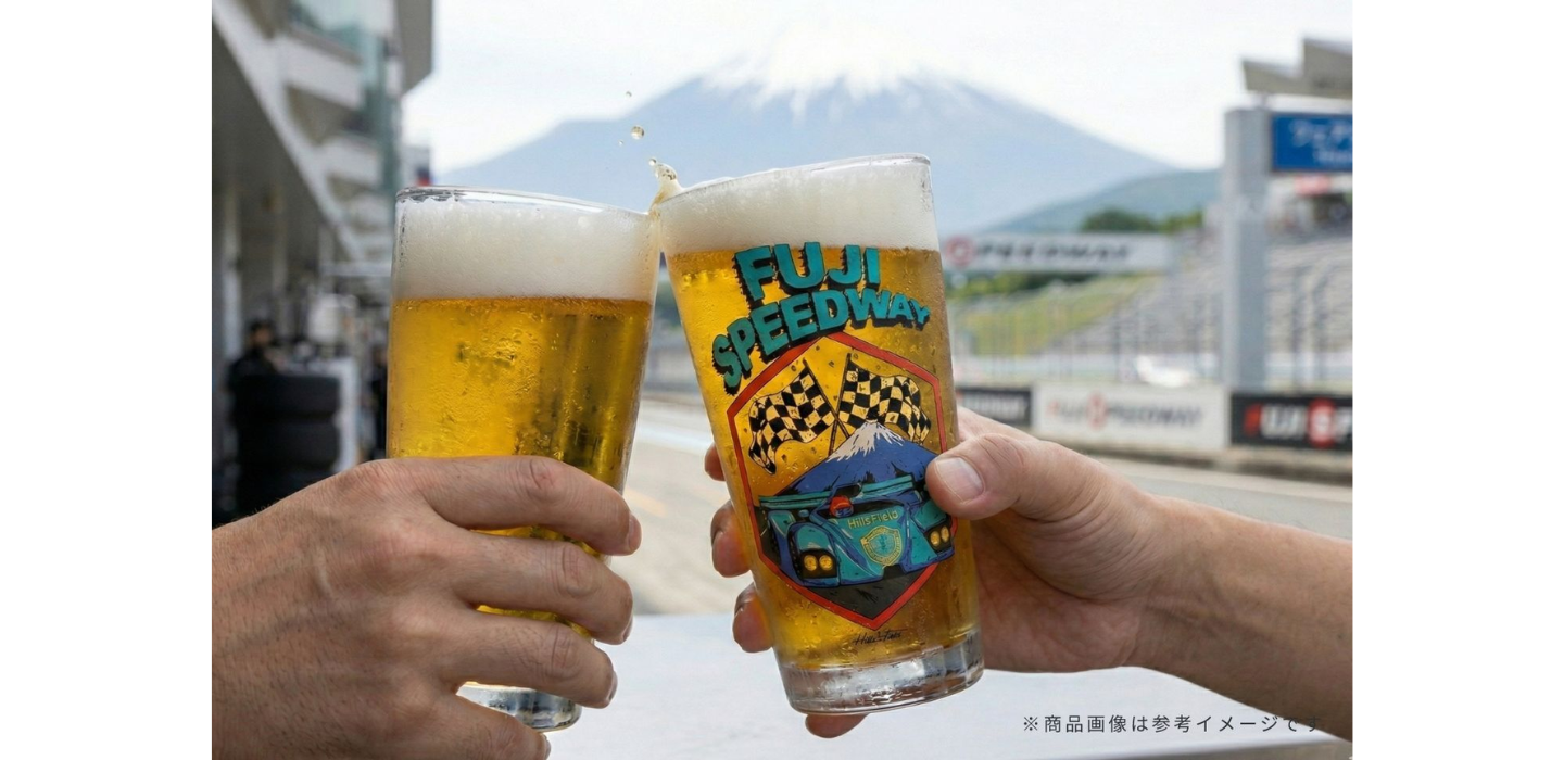 A popup booth from Shizuoka-based outdoor and camping brand HILLS FIELD in the event plaza during the Super Taikyu Fuji 24-Hour Race. The booth features collab merchandise — including a limited Fuji Speedway pint glass designed by graphic artist Hirotton — plus gear from the brand and a joint stall from local craft breweries Repubrew and 反射炉ビヤ. The brand's producer and popular YouTube creator '伊豆のぬし釣り' is scheduled to appear.